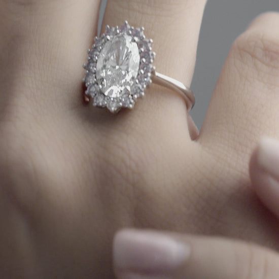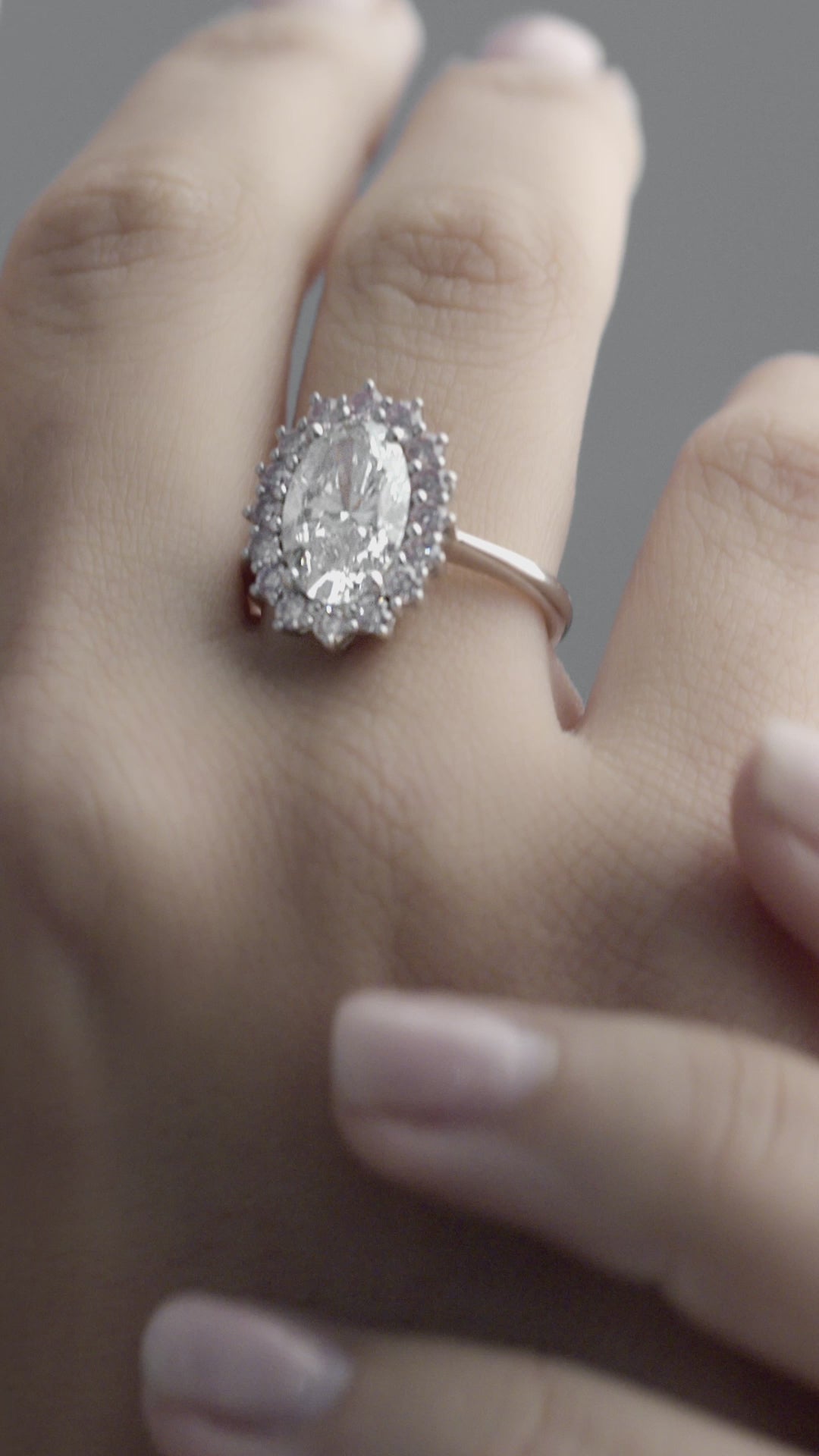 Questa preziosa creazione in oro 750 è un autentico capolavoro di maestria artigianale. Al centro, una raffinata pietra ovale da 3 carati brilla con eleganza, circondata da un delicato alone di scintillanti diamanti fancy pink. Un design senza tempo che esalta la bellezza naturale della gemma principale, esaltata dalla purezza dell'oro pregiato.